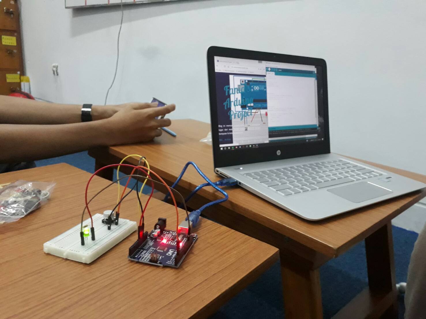Hubungkan Arduino yang telah dirangkai dengan komputer menggunakan kabel USB, kemudian jalankan source code yang telah dibuat. LED yang tertanam pada board Arduino akan berkedip jika kode yang kita buat berhasil dieksekusi oleh Arduino.