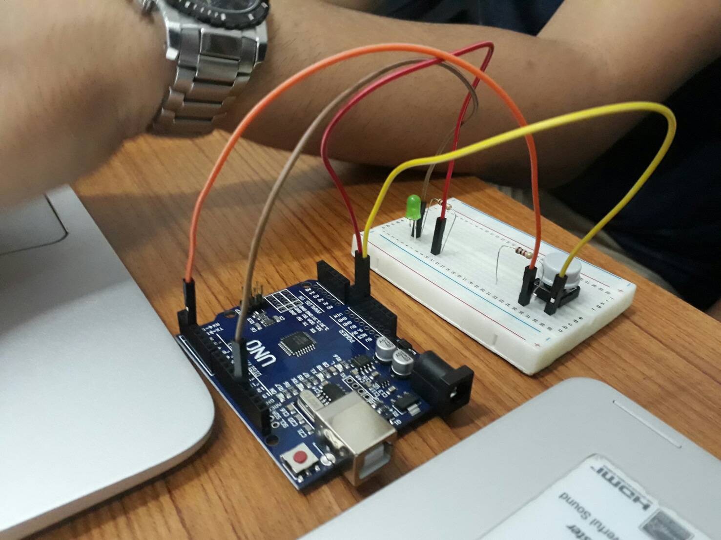 - Kabel kuning menghubungkan resistor untuk push button dengan pin input 2